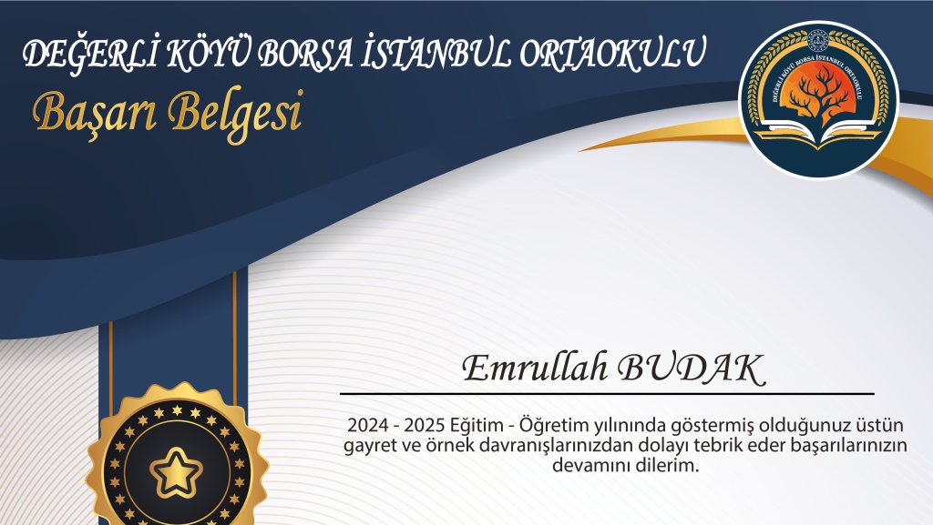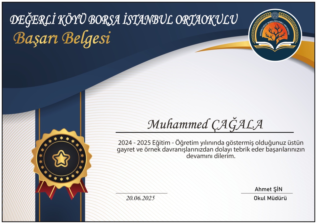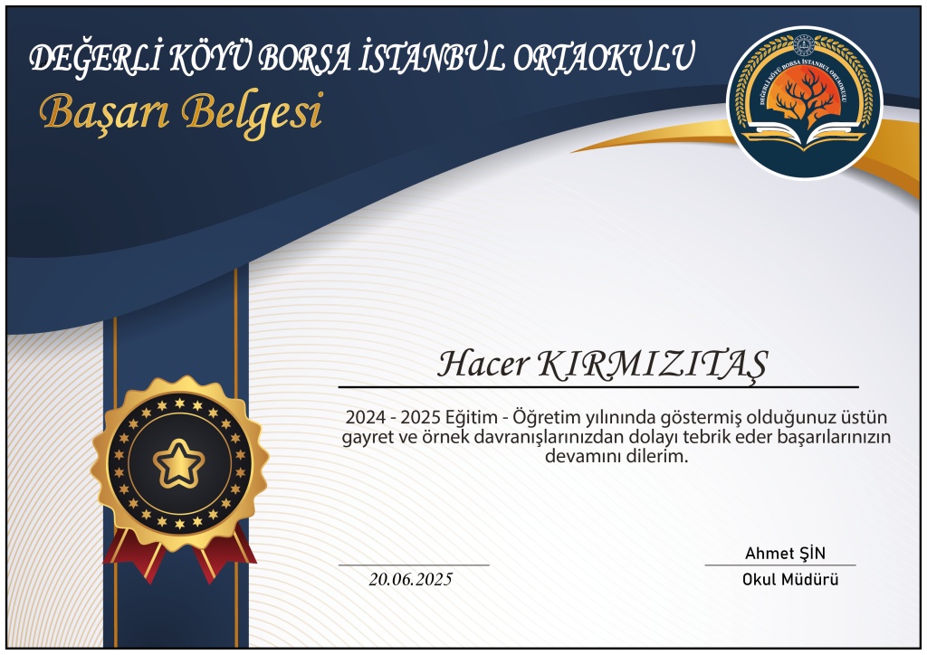 2024 - 2025 yılında yüksek başarı göstererek genel ortalaması doksan üzeri olan öğrencilerimize belgelerini teslim ettik. Değerli Köyü Borsa İstanbul Ortaokulu olarak gelecek yıllarda başarılarınızın devamını dileriz.